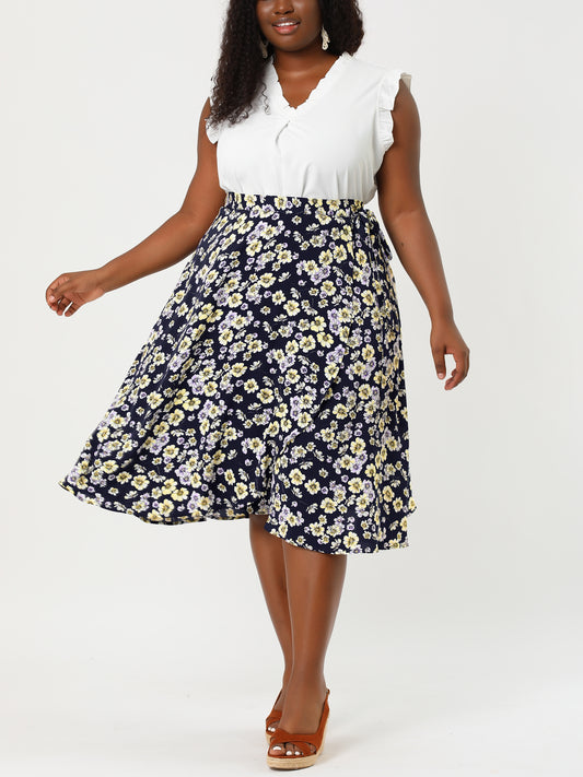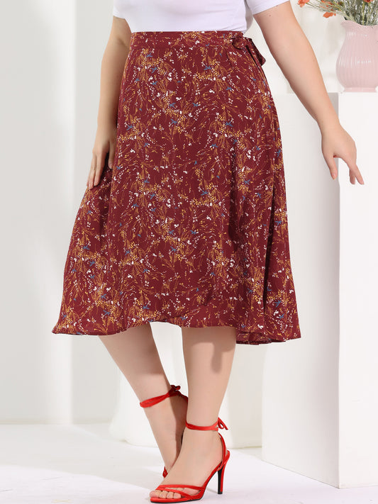 Women's Plus Size Boho Floral Wrap A Line Midi Chic Ruffled Hem High Waisted Skirt