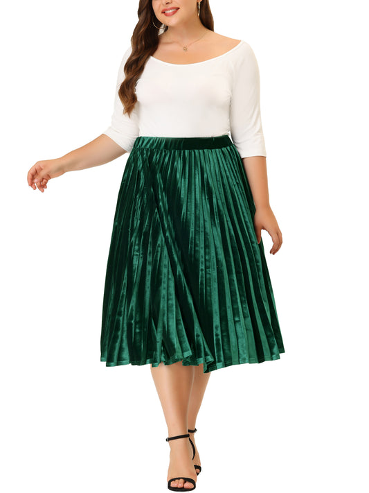 Women Plus Size Velvet Skirt Elastic Waist Metallic Accordion Midi Pleated Skirt