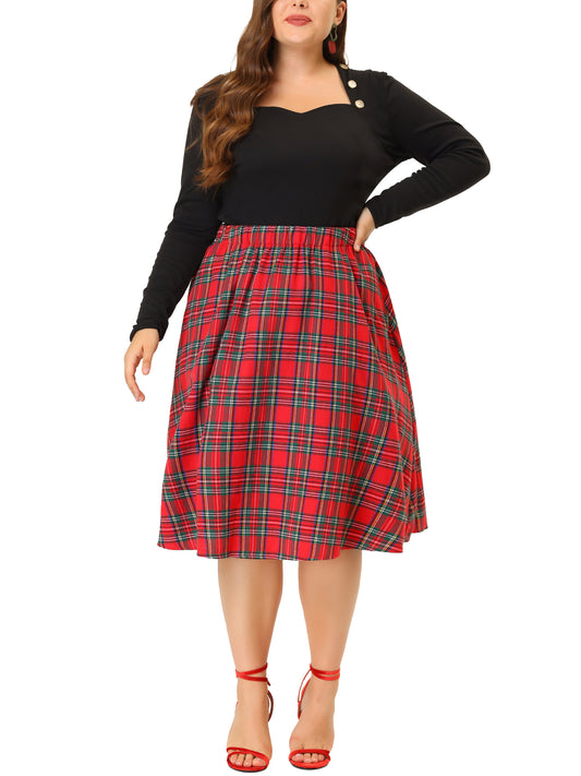 Women Plus Size Vintage Skirt A-line Plaid Printed Flare Elastic High Waist Midi Skirt
