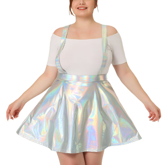 Women Plus Size Shiny Metallic Suspender Skirt High Waisted Holographic Rave Skirt