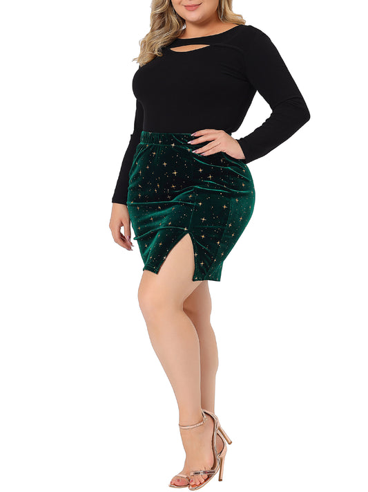 Women Plus Size Mini Skirt Shiny Gilding Metallic Stars Pattern Slit Bodycon Velvet Party Skirt