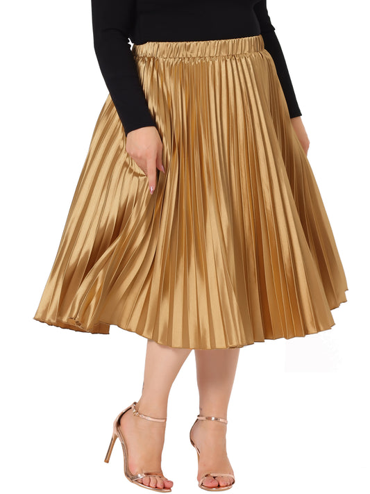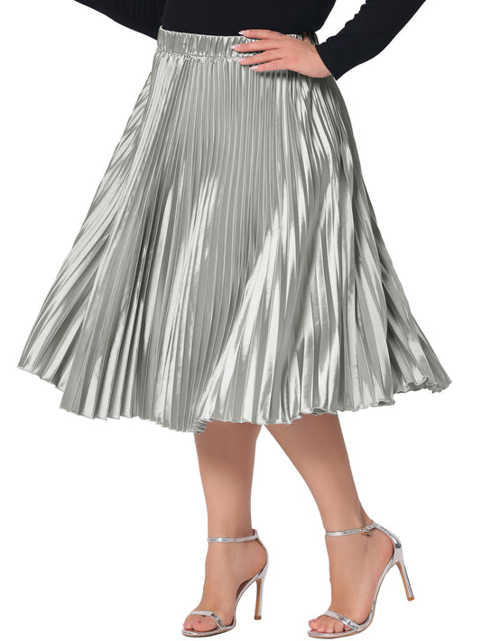 Women Plus Size Skirts Elastic High Waist Party Metallic Shiny Accordion Pleated Midi Skirt
