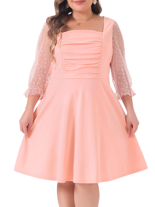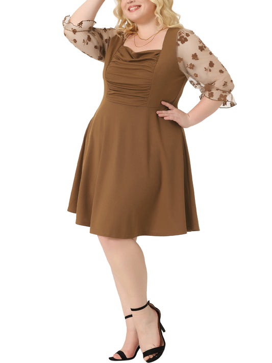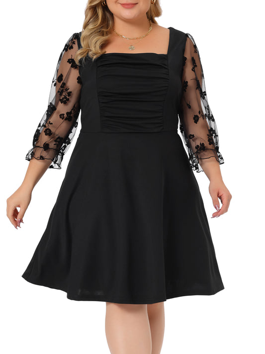 Women Plus Size Dresses Square Neck Floral Mesh Long Sleeves Evening Party Dress