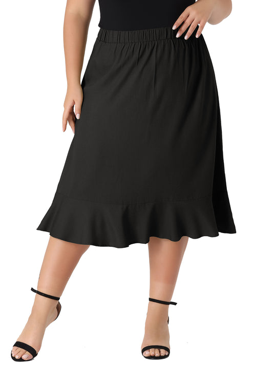 Women Plus Size Skirt Elastic Waist Ruffle Hem Chambray Midi Skirt