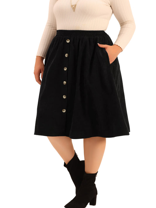 Women Plus Size Corduroy Midi Skirts Elastic High Waist Button Front A-Line Skirt with Pockets