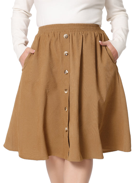 Women Plus Size Corduroy Midi Skirts Elastic High Waist Button Front A-Line Skirt with Pockets