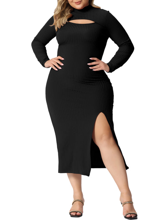 Women Plus Size Dresses Round Neck Cut Out Front Knee Slim Split Hem Bodycon Dress