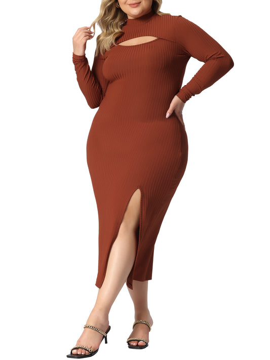 Women Plus Size Dresses Round Neck Cut Out Front Knee Slim Split Hem Bodycon Dress