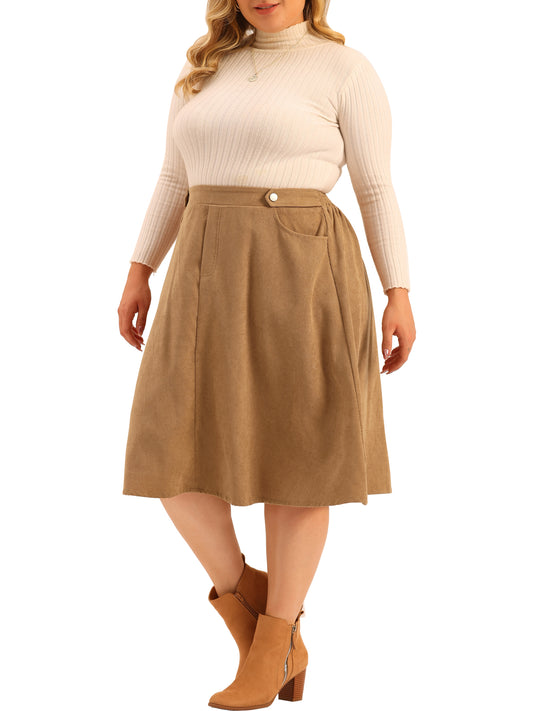 Women Plus Size Corduroy Skirt Elastic High A Line With Pockets Midi Skirt