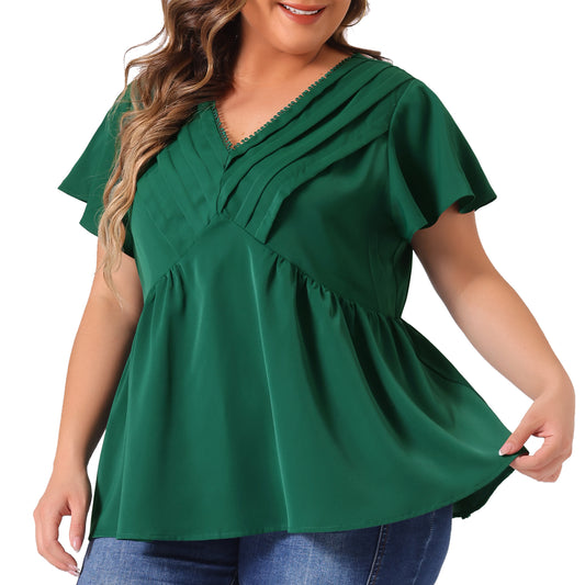 Women Plus Size Top Summer Flare Sleeve V Neck Lace Front Work Peplum Blouse