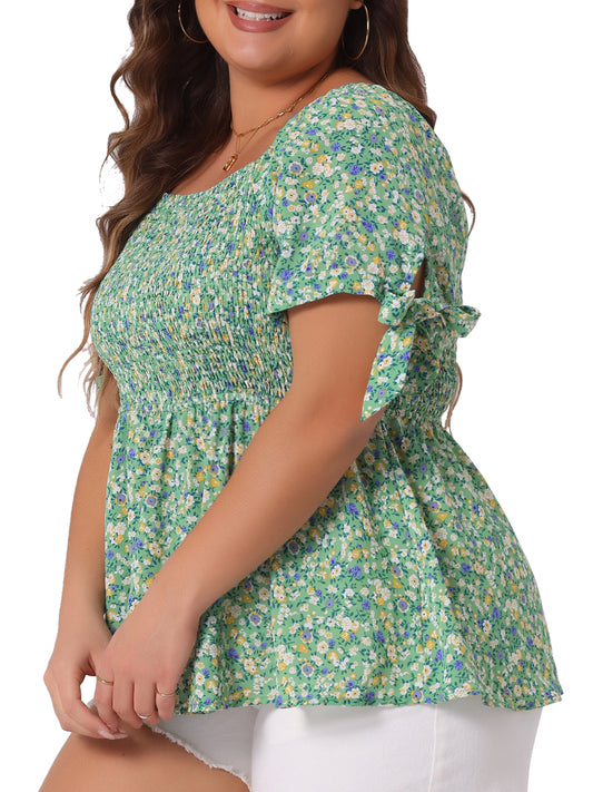 Women Plus Size Summer Top Square Neck Smocked Bow Tie Short Sleeve Peplum Blouse