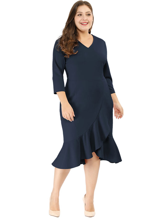 Women's Plus Size Business Ruffled Dress 3/4 Sleeve Office Work Cocktail Dresses Party Wrap Dress