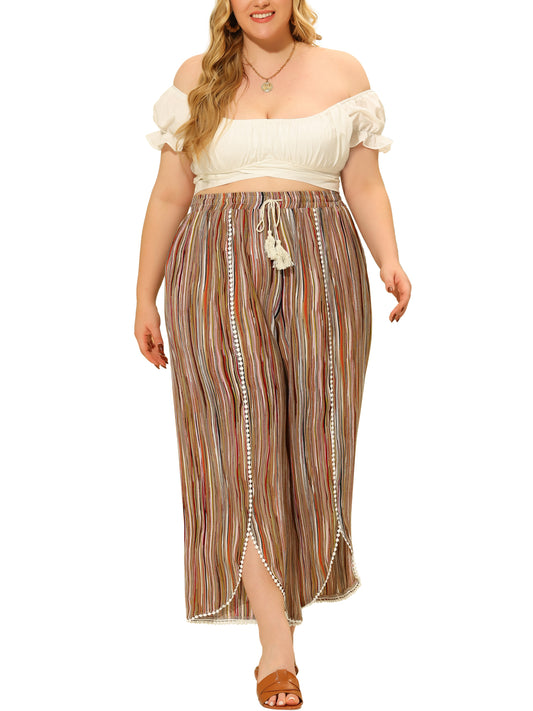Women Plus Size Split Elastic Waist Flowy Striped Wide Leg Pants