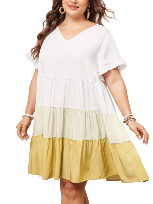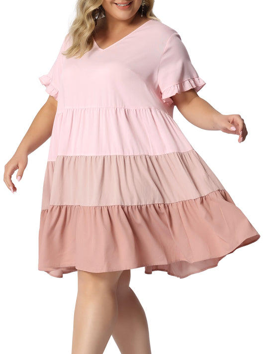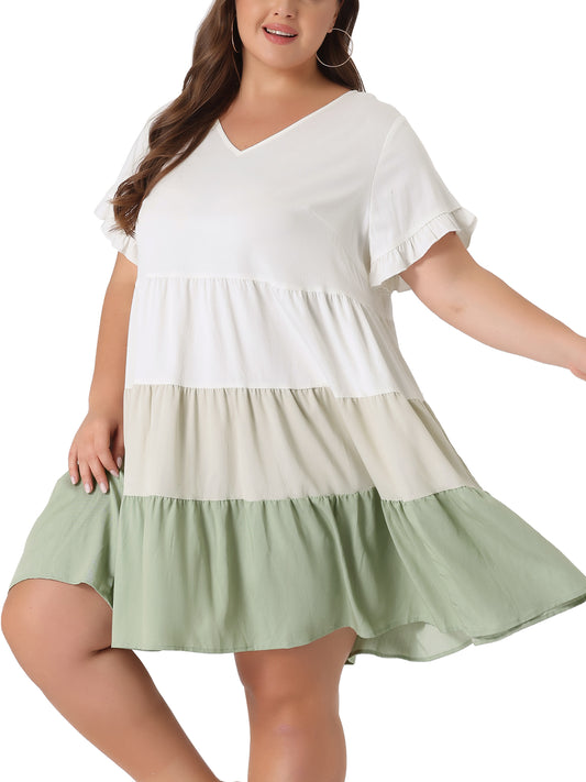 Women's Plus Size Babydoll Ruffle Short Sleeve Casual Loose Flowy Swing Hem Chambray V Neck Mini Dress