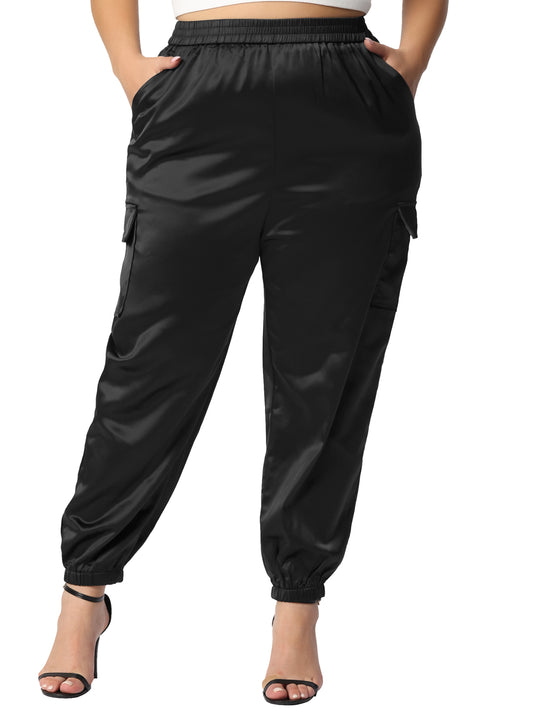 Women Plus Size Satin Joggers Elastic Waist Athleisure Ankle Length Cargo Pants with Pocket