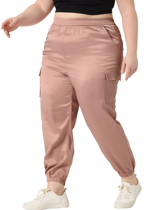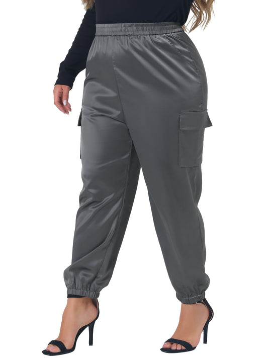 Women Plus Size Satin Joggers Elastic Waist Athleisure Ankle Length Cargo Pants with Pocket