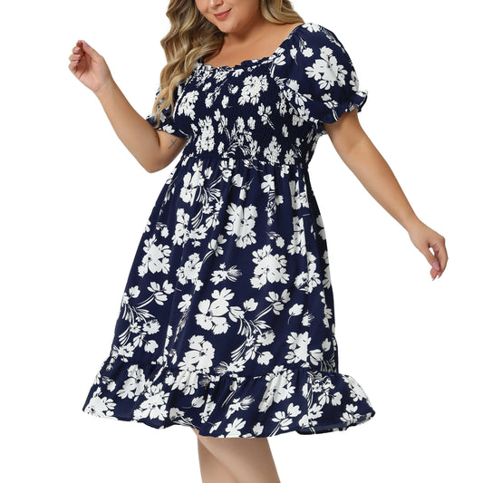 Women Plus Size Dress Ruffle Short Sleeve Flared Flowy Smock Floral Print Dress