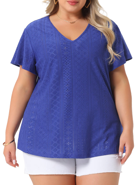 Women's Plus Size Summer Tee V Neck Hollow Flare Short Sleeve Casual Top Tunic