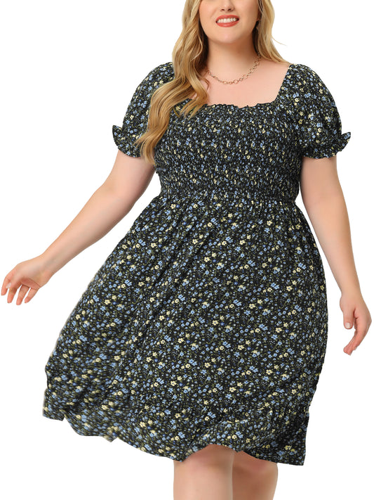 Women Plus Size Dress Ruffle Short Sleeve Flared Flowy Smock Floral Print Dress