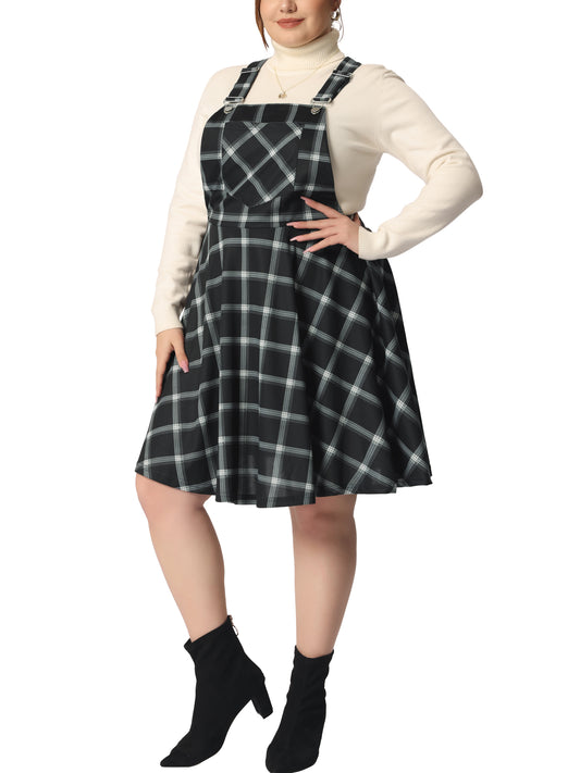 Women's Plus Size Casual Plaid Printed Overall Pinafore Dress Swing Adjustable Straps Dress
