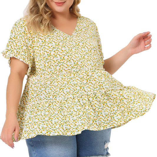Women's Plus Size Blouse Summer Tops V Neck Short Sleeve Boho Floral Babydolls Blouse