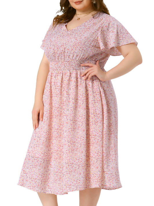 Women's Plus Size Summer Dress Floral Print V Neck Smocked A-Line Flowy Midi Dress