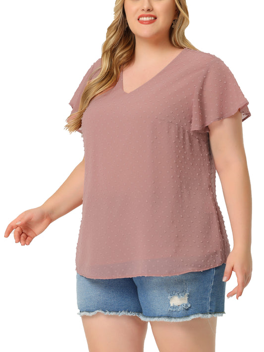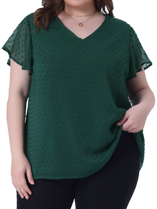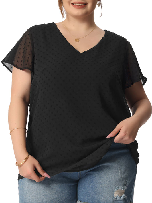 Women Plus Size Swiss Dots Blouse V Neck Summer Short Sleeve Casual Top