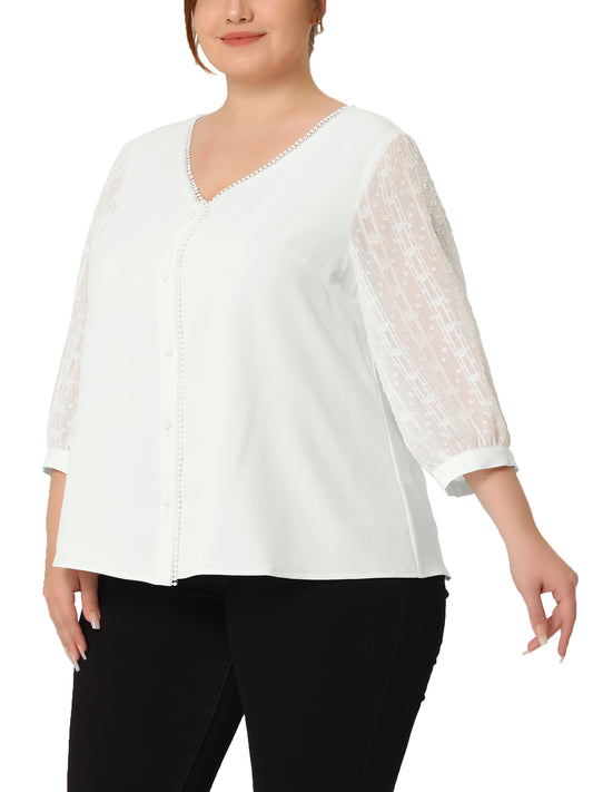 Women's Plus Size Top V Neck Sheer Lace Panel 3/4 Sleeve Button Up Lace Shirt