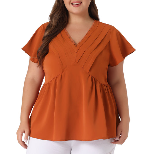 Women Plus Size Top Summer Flare Sleeve V Neck Lace Front Work Peplum Blouse