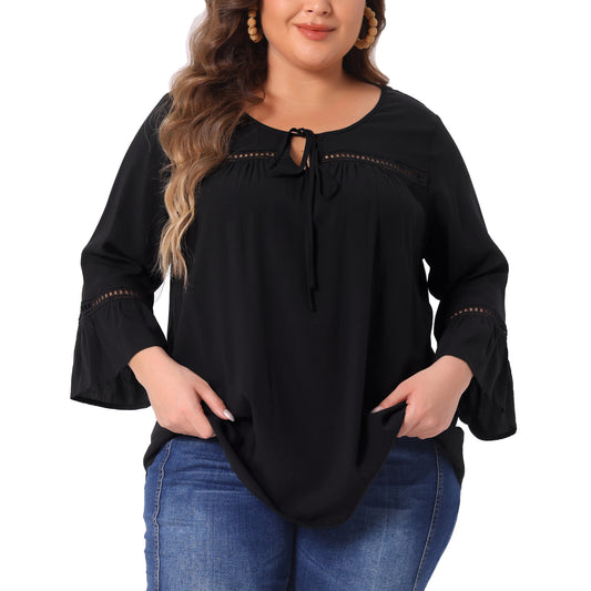 Women Plus Size Blouse 3/4 Flare Sleeves Peasant Keyhole Tie Casual Top