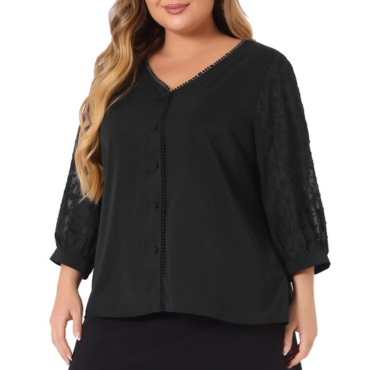 Women's Plus Size Top V Neck Sheer Lace Panel 3/4 Sleeve Button Up Lace Shirt