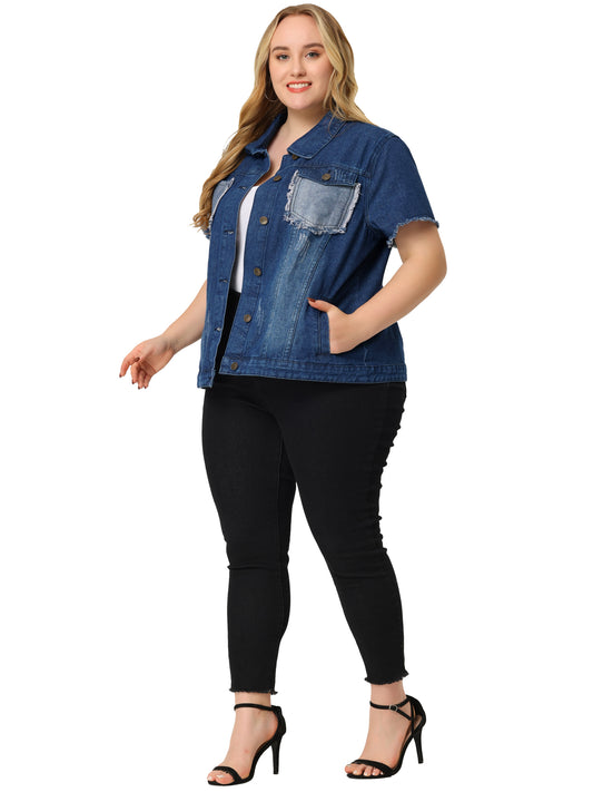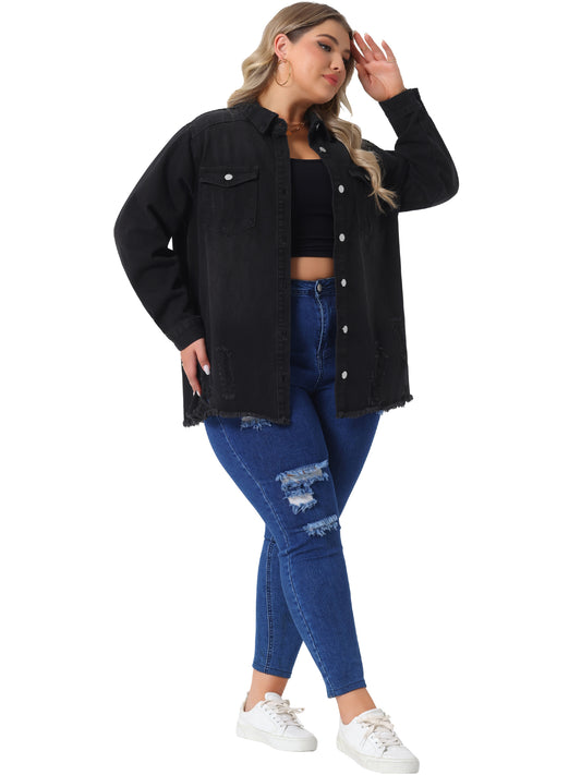 Women Plus Size Denim Jackets Frayed Hem Classic Washed Jean Jacket