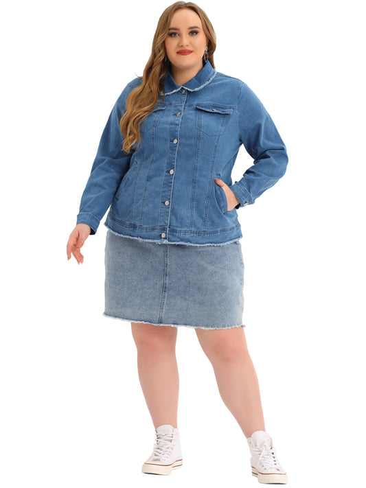 Women Plus Size Denim Jackets Frayed Hem Classic Washed Jean Jacket