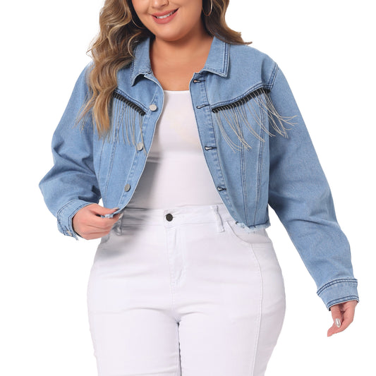 Women Plus Size Frayed Hem Tassel Button Jeans Cropped Denim Jacket