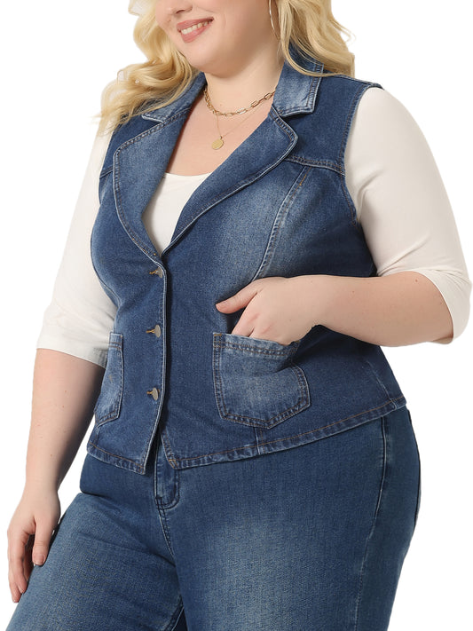 Women Plus Size Denim Vest Lapel Sleeveless Button Down Classic Jean Jacket Vest