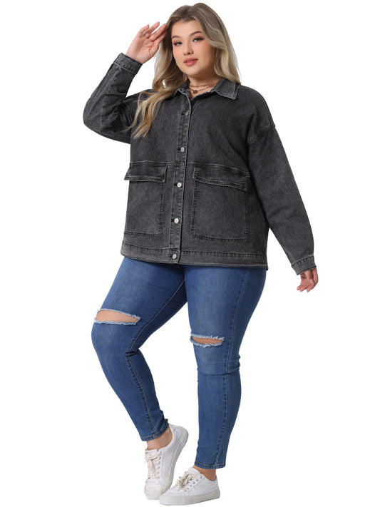 Women Plus Size Denim Jacket Casual Long Sleeve Jean Jackets with Pockets