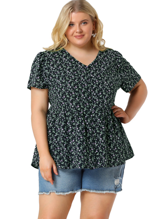 Women Plus Size Chiffon Shirt V Neck Ruffle Short Sleeve Floral Peplum Top