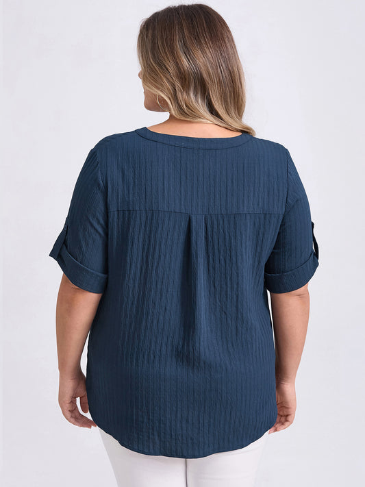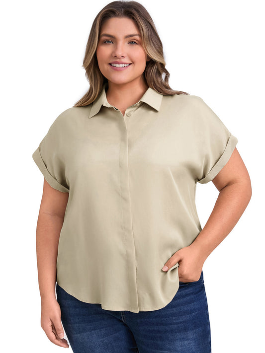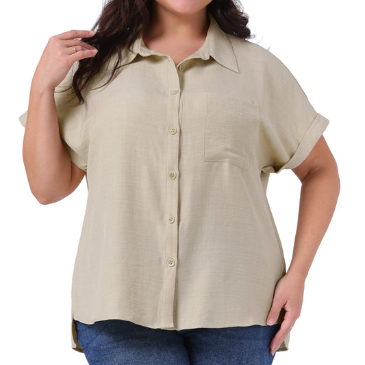 Women Plus Size Shirt Button Down Lapel Rolled Cuffed Short Sleeve Collared Casual Top