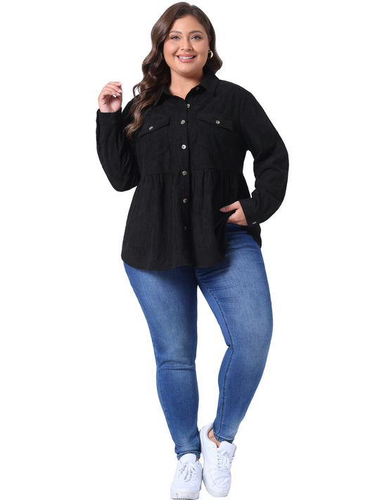 Women Plus Size Corduroy Shirts Peplum Cute Long Sleeve Button Down with Pockets Tops