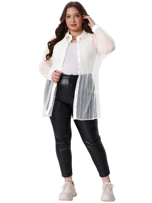 Women Plus Size Shirt Mesh Sheer Long Sleeve Button Down See Through Top