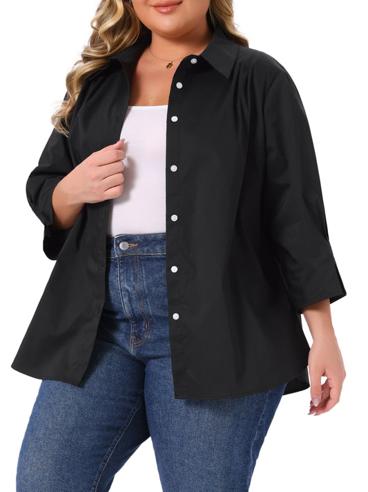 Women Plus Size Shirts Button Down Collar Pleated 3/4 Sleeve Casual Top