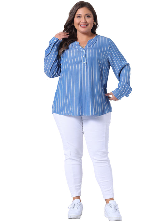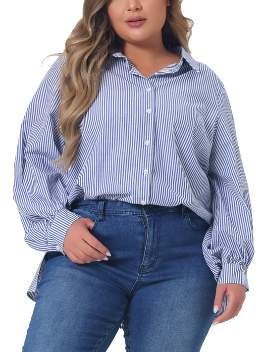 Women Plus Size Shirts Button Down Collared Long Sleeve Classic Office Work Striped Top