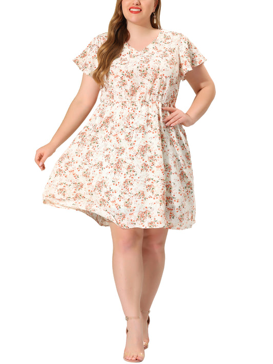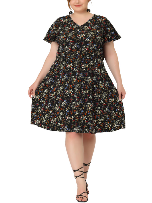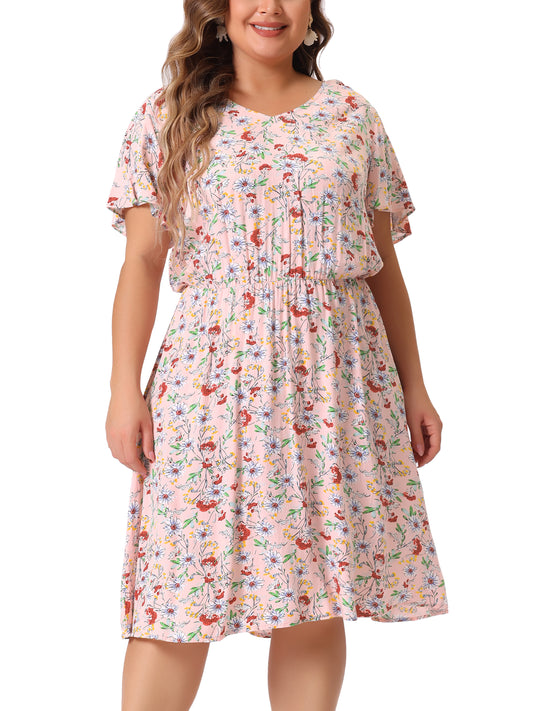 Women Plus Size Summer V Neck Flare Sleeve Sundress Peplum Midi Ruffle Dress