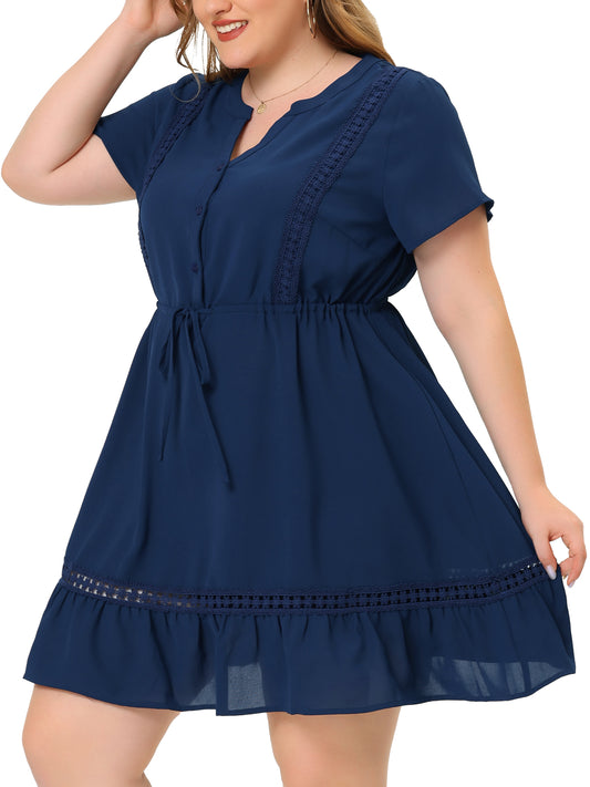 Women Plus Size Button V Neck Summer Midi Ruffle A Line Swing Dress