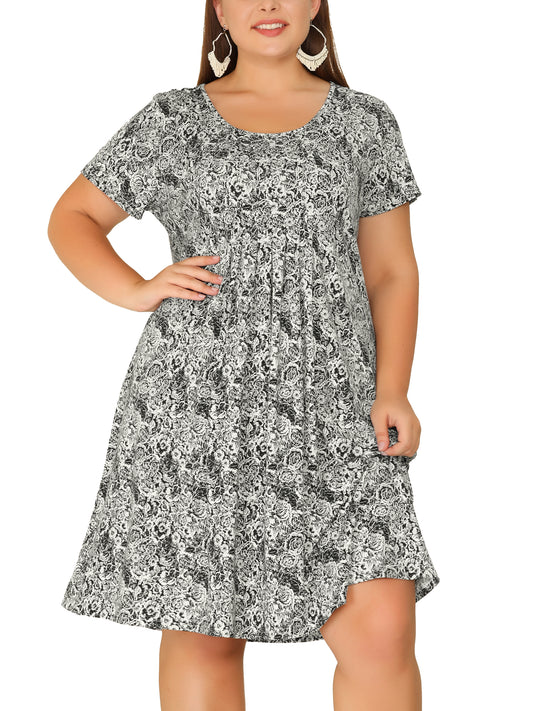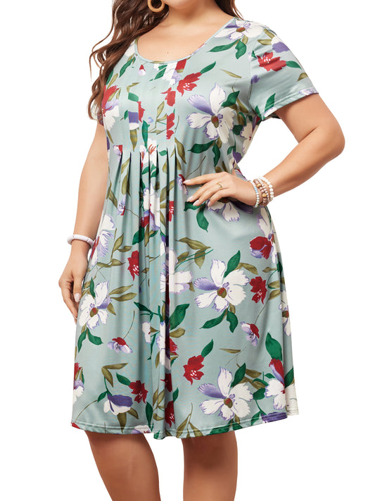 Women Plus Size Short Sleeves Pleated Summer Casual Loose Floral Dress