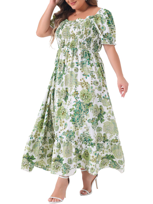 Women Plus Size Short Sleeve Shirred Square Neck Floral Maxi Long Dress