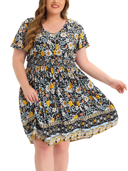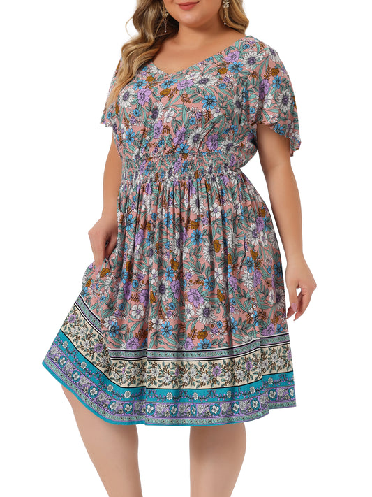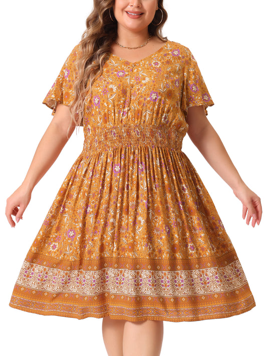 Women Plus Size Placed Pattern Bohemian Smock Waist V Neck Summer Midi Dress
