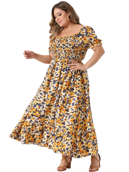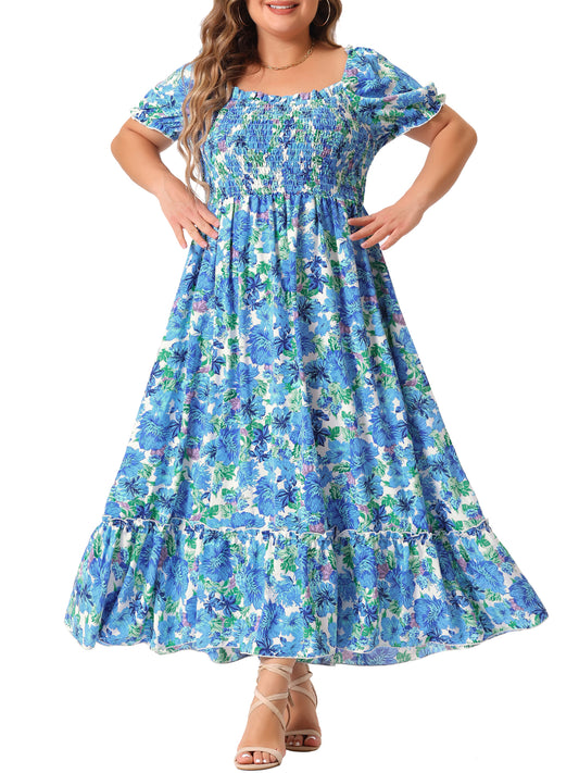 Women Plus Size Short Sleeve Shirred Square Neck Floral Maxi Long Dress