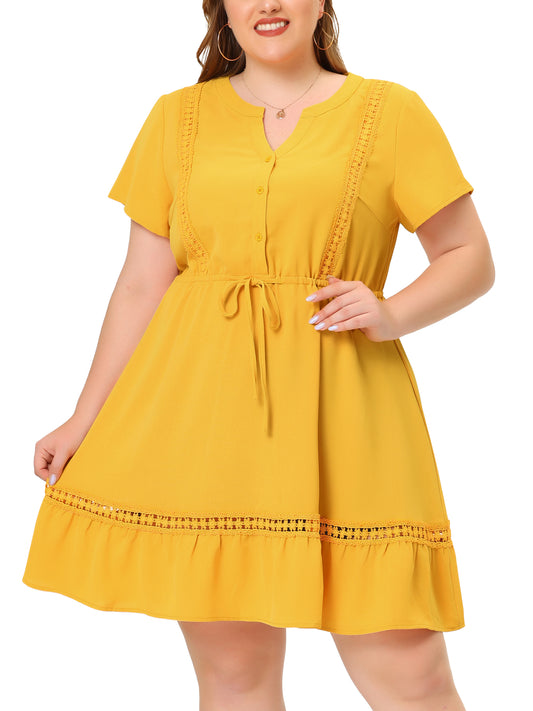 Women Plus Size Button V Neck Summer Midi Ruffle A Line Swing Dress