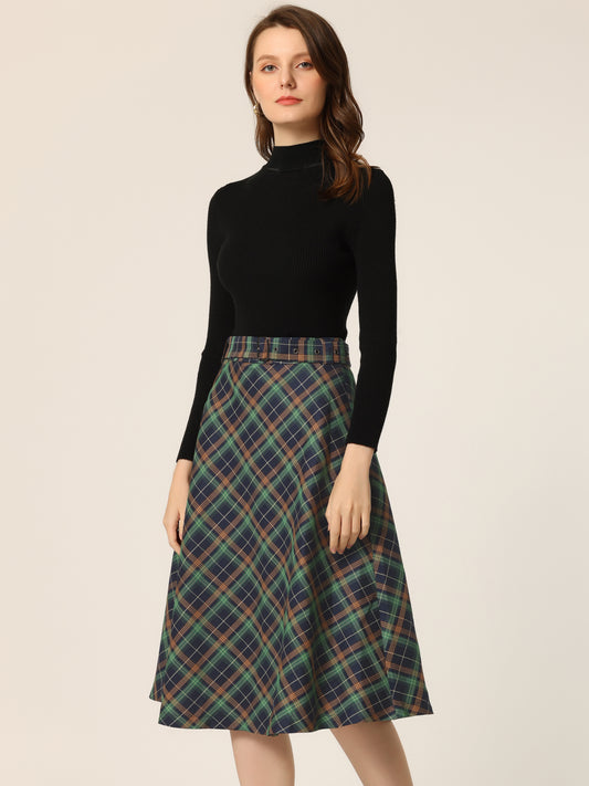 Women's Tartan Plaid High Waist Belted Vintage A-Line Midi Skirt (Available in Plus Size)